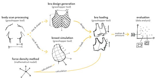 In engineering design research in general, the field of design space exploration has proven promising for enhancing the earliest stages of the design process. In architectural and building design, for example, methods have been developed and applied to increase the diversity and performance of design concepts, using a range of computational techniques [12,13,14]. The basic principles of design space exploration involve design parameterization; fast simulation or analysis; and techniques for sampling, optimization, and general navigation through a space of design alternatives. While this approach has not yet been applied to sports bra design, it has the potential to amplify the diversity and quality of design outcomes, leading to innovative new options for female athletes. Design space exploration is complemented by more detailed analyses and testing methods that can be carried out on selected design concepts later in the process.