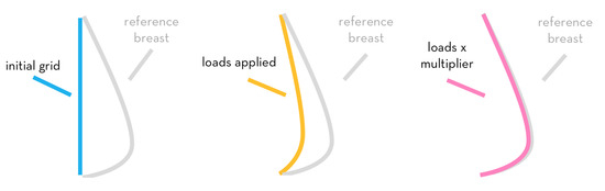 with the direction of load at each node equal to the normal vector of the deformed (loaded) mesh at that node. Because the normal vectors of a deformed mesh can only be determined after it has been loaded, the process needs to be iterated (or optimized) in order to approach more accurate normal vectors to input into the calculation. The breast simulation result following this process can be seen in Figure 8.