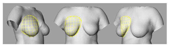 Because λbra (described earlier in Equation (3)) represents the additional effort needed to meet incompressibility of the breast, it is equated to the real and perceived pressure of the calculated condition. For example, a bra designed with stiffer members will require a larger λbra in order for the stretched mesh to reach the target volume, compared to a looser, less stiff bra. In this example, the larger λbra of the stiffer bra would indicate a higher pressure exerted onto the body by the bra, suggesting that the stiffer design might be perceived as being tighter.