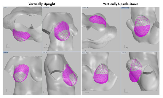 As described in the section on Force Density Method modeling and observed in Figure 10, each bra design is loaded in two separate scenarios, in order to make predictions about range of movement allowed by the bra. The scenarios can be any two angles of rotation of the breast, with respect to gravity. During the research presented in this paper, tests of the methods are conducted with the two scenarios of a breast when standing upright, and the same breast when rotated 180, such that it is upside-down.
