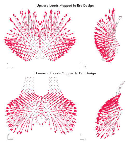Points and corresponding loads from the simulated breasts are mapped to points on the bra using nearest neighbor analysis after both geometries are projected to the same plane. Bra points that are not close enough to breast points (within a tolerance) have expected loads of zero. This can be observed in Figure 10, which shows the vectors of two loading scenarios that have been mapped to a bra design. Many of the gray bra points in the bottom center of the bra, as well as towards the top of the strap, do not have vectors mapped to them. This is because there is no expected breast tissue behind those vertices in the bra. Finally, as breast volume is still considered incompressible within a bra, the bra loading simulation also implements a multiplier (λbra):