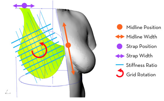 The bra generation tool takes in 5 geometries as input: 4 curves, and 1 point, all from a single side of the chest (this tool assumes symmetry); these curves define the base size and fit of the generated bras. In addition to geometry, 6 variables are defined that affect the shape and construction of the bra. These variables (midline position, midline width, strap position, strap width, stiffness ratio, and grid rotation) are diagrammed in Figure 11. The generated bras are reflective of fabric construction by defining a grid, which is orthogonal to itself but can be rotated within the bra (much like fabric can be constructed into a garment at different angles). The variable of “stiffness ratio” describes the difference in stiffness of one direction in the grid to the other, which is similar to the properties that fabric inherits from its warp and weft directions. For fair comparison, the stiffness ratio is applied to each direction as a percentage of a base stiffness which is the same for all generated bras.