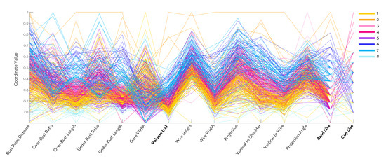 k-means clustering (a supervised-learning algorithm) aims to partition a given n-dimensional data set into k number of clusters around k number of centroids, such that the distance of a data point to the centroid of its assigned cluster is minimized in each dimension. Using squared distances analysis, eight clusters were identified. These eight clusters are represented in Figure 14 in a parallel coordinate plot.