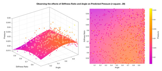 In Figure 16, this data is shown in three dimensions, as well as in a 2-dimensional projection. This allows for easier, more intuitive understanding of the interactions between the two variables explored in the plot. A brief glimpse at the plot shows that the designs that best minimize pressure are in the top left region (deeper purple), where stiffness ratio is high and angle is low (meaning designs where one direction is notably stiffer, and that stiffer direction is oriented horizontally).