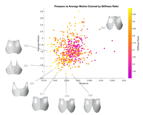 Using this plot, the best performing designs (the designs that minimize both performance metrics of pressure and average motion) can be found by searching the pareto front. In Figure 17, the output rendering of each of those best performing designs is included. An interesting trend that is now visually apparent is that as the midline comes up higher at the bottom center of the bra (designs 409 and 168 are such examples), average motion is most reduced but pressure increases. This might be reflective of the impression that encapsulated bras, which are recommended for bounce reduction and support, are also associated with tightness and digging in [11].