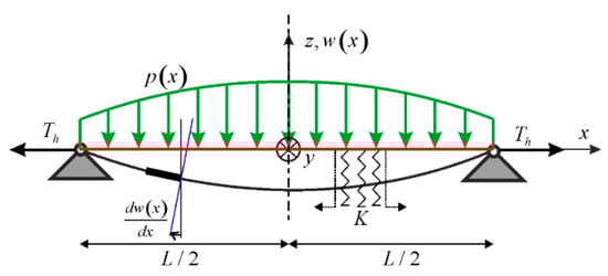 The equivalent load in a one-dimensional task should have a distribution ensuring a solution corresponding to the actual behaviour of the structure and enabling the most accurate determination of all quantities necessary for the proper design of the LTP geosynthetic reinforcement. A membrane modelling the geosynthetic reinforcement, loaded with the equivalent load of a given general distribution, is shown in Figure 2. The parameter K is equivalent subgrade reaction value [kN/m3].