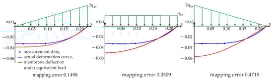 In further analyses, 41 load distributions from inverse triangular to triangular () were taken into account with the increment equal to 0.025. The deflection curve of the membrane was determined for each analysed load distribution. In order to determine the forces in the membrane and its deflection curve , the method presented by the authors in [] was applied. This method is based on expanding into the Taylor series the expression for the curve length used to determine the deformation in the membrane. The membrane tension force can be determined from the condition for strain equality (see [,]). Unfortunately, this equation is highly nonlinear and additionally the accuracy of the solution depends on the number of series terms in the expression for the curve length. Tension force is found using numerical methods and the Wolfram Mathematica program. In order to compare the deflection of the membrane under each of the analysed load distributions with the results of experimental tests (laboratory and in situ), the formula for the interpretation of the mapping error was introduced in the following form: