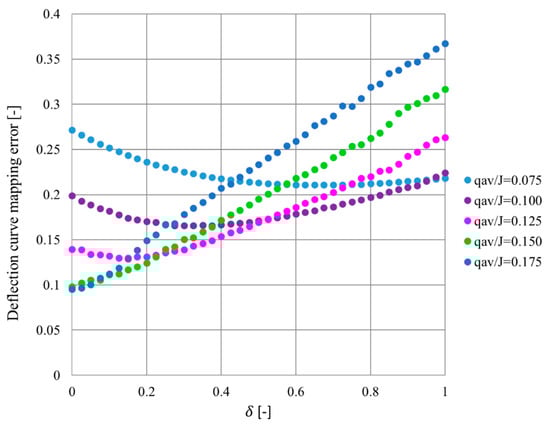 In the performed study, 41 distributions of equivalent load (from inverse triangular, through uniform to triangular and intermediate distributions) were analysed for each case. In each analysed case, the only variable was load distribution (parameter ). The obtained results of the deflection curve mapping error allowed for the formulation of the following conclusions: