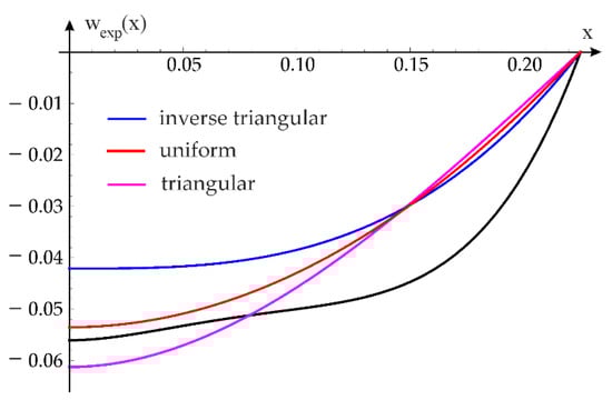 Parameter is the parameter in the range from 0 to 1. The load attains the inverse triangular distribution for , the uniform distribution—for , and the triangular distribution—for . Examples of load distributions depending on parameter are shown in Figure 3.