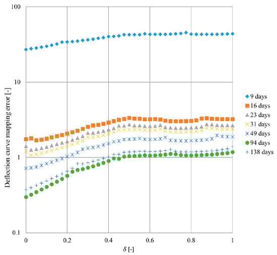 For sections 3R and 4R, settlements were measured at 9, 16, 23, 31, 49, 94 and 138 day after installation of the geosynthetic. This allowed the analysis to be carried out over time. In the case of Section 3R, the highest error values were obtained for measurements after 9 days (Figure 14). For the measurements after 16 days, there was a rapid decrease in the values of the deflection curve mapping errors. For measurements of settlement after 23 days, the error values for all analysed distributions increased significantly, and for subsequent measurements, the obtained error values gradually decreased. The nature of the distribution of the error value for different load distributions is similar, but for subsequent measurements of settlement, the difference between the smallest error value for (which corresponds to the distribution of the equivalent load in the form of an inverted triangle) and the error values for the distributions for (distributions from equal to triangular) decreases. For all measurements in Section 3R, the lowest mapping error was obtained for the inverse triangular distribution (). Later, the error value grows, and from a uniform to triangular distribution ( from about 0.5 to 1), the error value for measurements from the 16th day after installation is at a similar level for individual series of measurements.
