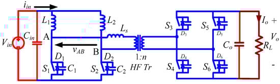 Electric transportation, energy storage, renewable energy systems, hybrid electric vehicles (HEV), and fuel cell vehicles require bidirectional power electronics for power processing [,,,]. A DC-DC front-end converter is the major part of a fuel cell inverter, which boosts the low-voltage fuel cell stack’s voltage to the peak of utility line alternating current (AC) voltage []. Among various categories of high-frequency (HF) soft-switching isolated DC-DC converters, a current-fed converter is popular in fuel cell applications. Fuel cells produce low-voltage direct current (DC), which has a wide variation with load current and requires a high voltage conversion ratio [,,,,]. Current-fed topologies offer high voltage gain with a stiff DC input current []. The historical problem with current-fed converters has been the necessity of a passive snubber [,] or an active-clamping circuit [,,] to clamp voltage overshoot across the semiconductor devices at their turn-off. Passive snubbers lead to poor efficiency because the energy stored by the clamping capacitor is later dissipated into the resistor. However, better efficiency is obtained, along with zero voltage switching (ZVS) of the semiconductor devices, with an active-clamping circuit [,,], at the cost of additional footprints of floating active device(s) and a large HF clamp capacitor for accurate and effective voltage clamping. Additionally, the boost factor of the converter is reduced as well as the high peak, and circulating currents can be observed at light load. In [], a new modulation technique of high-voltage side devices was proposed to solve the voltage spike problem of primary devices, eliminating the requirement for an external snubber. A current-fed half-bridge DC-DC converter was proposed as shown in Figure 1 with a new modulation, which was studied in [] to achieve zero current switching (ZCS) commutation of semiconductor devices along with natural device voltage clamping.