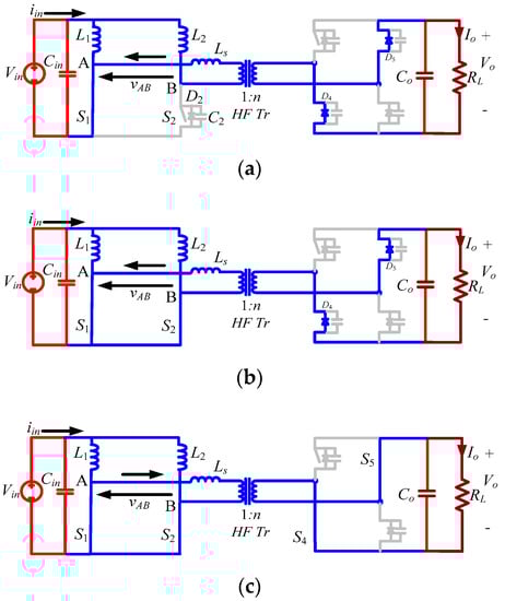 The primary side devices S1 and S2 are operated with identical gating signals phase-shifted with each other by 180°. The duty cycle of the primary switches is always kept above 50%. The operation during different intervals in a one-half switching cycle is explained with equivalent circuits shown in Figure 3.