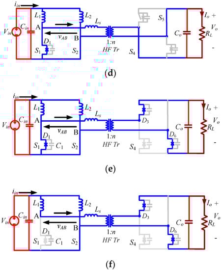 Equivalent circuits during different intervals of the operation for the waveform in Figure 2 Reproduced with permission from [], IEEE, 2020. (a) S2 in blocking mode; (b) S2 is turned-on; (c) ZVS turn-on of S4 and S5; (d) ZCS turn-off of S1 and body diode conducts; (e) D3 and D6 start conduction for rectification; (f) S1 goes in blocking mode.