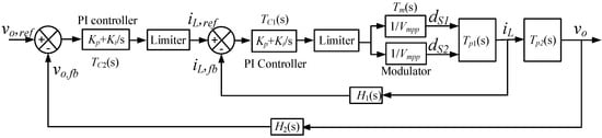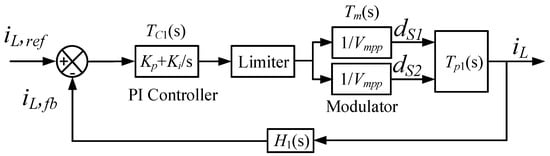 The schematic diagram of the inner current control loop is shown in Figure 7. The input inductor current is fed back to the error amplifier with the gain of H1(s). The error is processed by a PI controller, and the output of the controller is compared with the modulator to generate the gating signals of the devices. The inductors’ currents iL1 and iL2 are then regulated by adjusting the duty ratio of the switches.