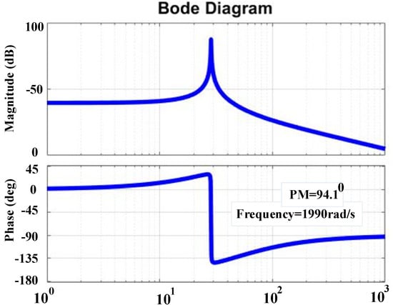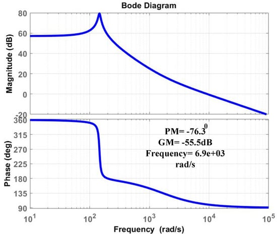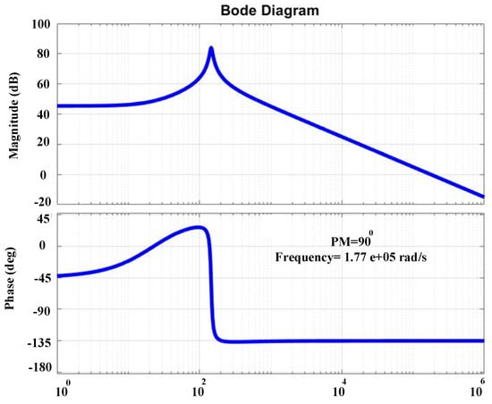 The gain margin and PM of the current control loop without controller is plotted in Figure 8, which shows PM = at 177 krad/s. The PI controller is designed at PM of in Figure 9 to increase the low-frequency gain and to reduce the steady-state error [].