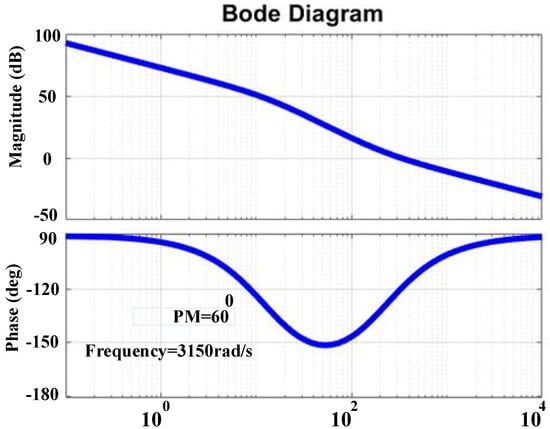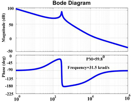 PI controller parameters are designed to obtain PM of 60° [,] at the gain crossover frequency of 31.5k rad/s (5000 Hz) (Figure 9). Low-frequency gain is improved. It results in the gain Kp and Ki as 0.16 and , respectively.