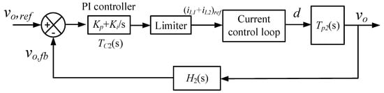 The outer voltage control loop regulates the output voltage at the reference value by setting reference for the current through the input inductors as shown in Figure 10. The inner current control loop has faster dynamics compared to the outer voltage loop. Hence, the current loop dynamics are neglected during the design of the voltage controller []. Its transfer function is not included, and the perturbation in the duty cycle can be neglected. Therefore, the inductor current to output voltage transfer function Tp2(s) is obtained as: