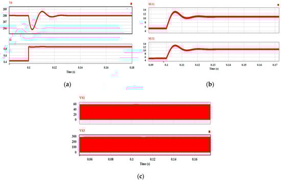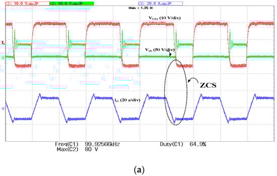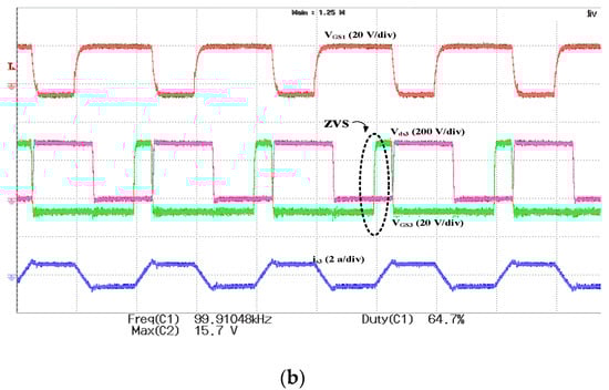Voltage waveforms VGS and VDS across the devices clearly demonstrate the ZCS of the primary side devices and ZVS of the secondary side devices under both load conditions. The results are satisfactory during the transients that occurred due to sudden load disturbances while maintaining the steady-state performance. The steady-state performance is retained at the originally proposed in []. Corresponding gate-to-source and drain-to-source voltage waveforms of the secondary side devices are shown in Figure 18b and Figure 19b. In these waveforms, gate-to-source voltage () is applied when the voltage across secondary device VDS is zero already, which ensures ZVS operation in secondary devices. It confirms the soft-switching of all the devices.