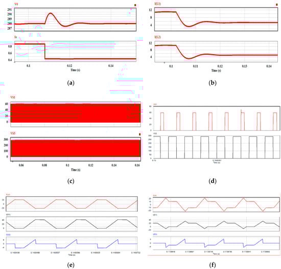 The load is changed from 50% load to rated load (Figure 13) and from full load to 50% load (Figure 14). It should be observed that the overshoot or undershoot in output voltage for both step changes is 2V, which demonstrates the excellent stability of control. Load current and the two input inductor currents smoothly change to the next steady-state value. The settling time of the inductors’ current and load voltage is nearly 25 ms. The voltage across the primary switches (VS1) is clamped at the reflected output voltage, and the voltage across the secondary devices (VS3) is clamped at the output voltage Vo without any overshoot during the load transients, ensuring safe operation of the converter. Figure 14d (zoomed waveform in transient period) shows voltage across the primary side devices is clamped at the reflected output voltage, while voltage on the secondary side devices is always clamped at output voltage. Figure 14e,f shows steady-state (zoomed) waveforms at rated load and half load, respectively. It should be noted that primary side devices maintain ZCS, and secondary side devices maintain ZVS under both conditions.