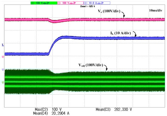 Hardware result for step change in load from 50% load to full load: (1) voltage VAB (100 V/div), (2) inductor current iL (10 A/div), and (3) output voltage Vo (100 V/div).
