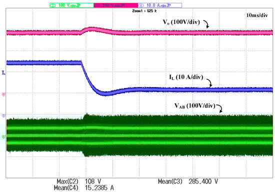 Hardware result for step change in load from full load to 50% load: (1) voltage VAB (100 V/div), (2) inductor current iL (10 A/div), and (3) output voltage Vo (100 V/div).