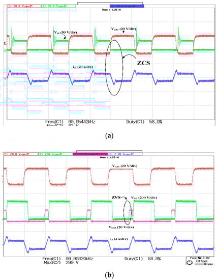 Experimental results for = 12 V at 50% load: (a) gate-to-source voltage , current across primary-side MOSFET is1 (20 A/div), and voltage = 50 V/div; (b) gate-to-source voltage (20 V/div), drain-to-source voltage (200 V/div), and current across secondary-side MOSFET is3 (2 A/div).