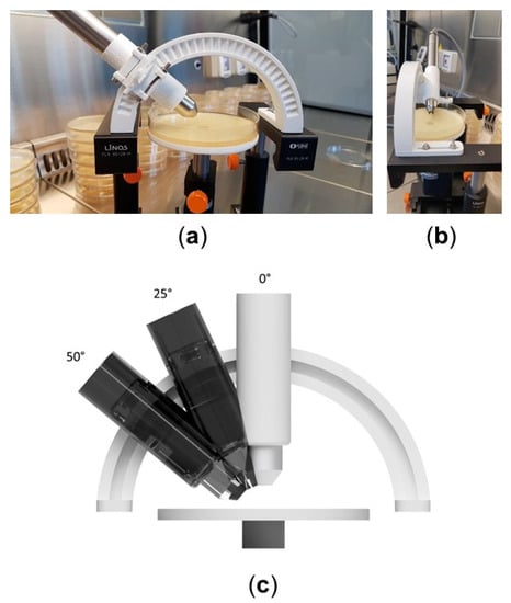 The respective setup consisted of an optical rack with a semi-circular rail which possessed notches on one side in 5° steps (Figure 2). A carriage can be moved on this rail, which contained the kINPen® MED-β. The kINPen® Med-β was always tilted in the same direction from the top to the left (Figure 2a,c, 0° to 50° (and up to 60° for (V)UV determination without plates)). The distance from the nozzle to the surface of the sample was 8.5 mm. A height-adjustable sample holder was also part of the optical rack to ensure an easy exchange of samples.