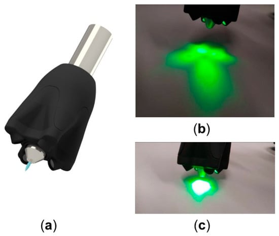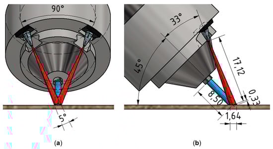 Two laser sensors (VL6180X) are distributed around the kINPen® MED-β. The laser proximity sensor works based on absolute time of flight measurement. The time required for the signal to be detected after transmission and reflection is proportional to the distance the signal travels. The chosen sensor possesses a cross talk elimination option and ambient light detection. In this way, it can detect the signal precisely even at short distances and independent of the reflectance and color of the reflecting surface. The sensors are aligned directly with the effluent at a distance of 7 mm to 10 mm (on average 8.5 mm) to ensure the maximum efficacy when the kINPen® MED-β is tilted, but also in case of a vertical application. In order to further minimize the signal area, an aperture is placed in front of the sensor. This ensures that the sensor area lies directly on the effluent and scarcely more area is detected than the visual effluent contact area of the kINPen® MED-β. This eliminates errors caused by unevenness and mistakes through tilting. It has to be mentioned that the conceivable laser sensor VL6180X works with a wavelength of 850 nm. The plasma generated by kINPen® MED-β and argon as a feed gas also emits light of this wavelength, which may result in an incorrect distance measurement. In case this could be a problem under application-oriented conditions, the focus of the sensors can be shifted, albeit the possibility of errors due to unevenness may increase again. In addition, it has to be ensured that the device is not tilted in such a way that the sensors lie on the bottom side. Thus, the upper side should therefore be clearly marked or four sensors should be used with a automatic recognition of the sensor position. It is known that the effective area of the kINPen® MED-β is larger than the visible effluent [,]. Thus, this area has to be visualized for the attending specialist. This illumination should be visible under application-oriented light conditions and should not influence the functionality of the kINPen® MED-β. Thus, several LEDs can be arranged symmetrically around the kINPen® MED-β, illuminating a large part of the surface (Figure 4). The LEDs have to be positioned in such a way that the beam geometries of the illumination cones and of the efficacy cones are adjacent to each other. In addition, a ring aperture should be placed in front of the LEDs, which would only allow a narrow gap of light to pass through. The gap forms a circle that encloses the effective area.