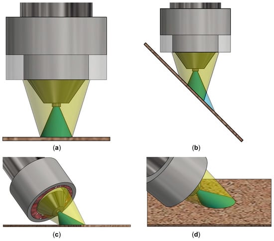 Concept of visualization; Illumination of treatment area using circular aperture for fixed incidence angle (aperture replaceable); (a) circular aperture for perpendicular (0°) and (b) tilted application, (c,d) including different perspectives using tilted device; green: estimated effective plasma zone, yellow: LED-illuminated zone.
