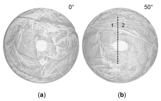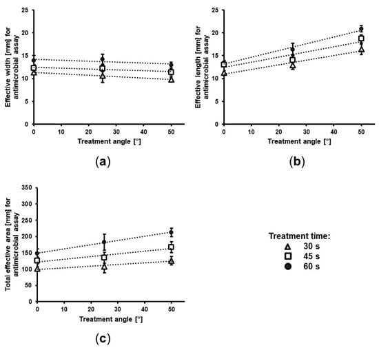 The width and length of the zones decreased at least slightly (by 7–14%) and increased (by 30–36%), respectively, with rising incidence angle (Figure 6a,b). The total effective area increased with rising treatment time and tilting (Figure 6c). Thus, the effective area for a 50° tilt was 25% bigger than for the vertical treatment for 45 s.
