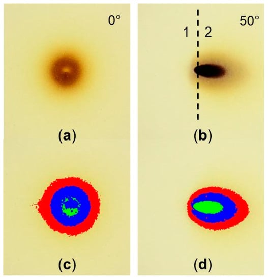 Depending on the applied treatment axis, the zones were circular or elliptic with a comet-like shape. If the samples were treated vertically, a circular effective area was obtained which was characterized by all three zones (Figure 7a,c). With increasing tilting of the kINPen® MED-β, the shape of the effective zones became increasingly comet-like with an intense center spot and an expanding tail (Figure 7b,d).