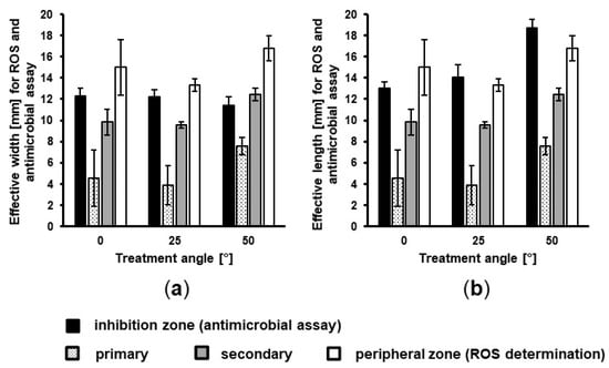 Effective (a) width and (b) length of the inhibition zones in the antimicrobial assay (Staphylococcus aureus DSM 799/ATCC 6538, M ± SD, n = 6) and the ROS determination (M ± SD, n = 3) of primary, secondary and peripheral zones depending on incidence angle (0°, 25°, 50°) after 45 s treatment with kINPen® MED-β.