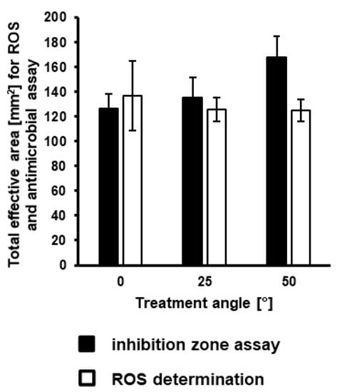 The total area of the inhibition zones (S. aureus) increased (Figure 6c) whereas ROS decreased slightly by 9% with rising incidence angle (Figure 9). Thus, the total area of the inhibition zone in the antimicrobial assay for 50° was 16% larger than that of the ROS analysis.
