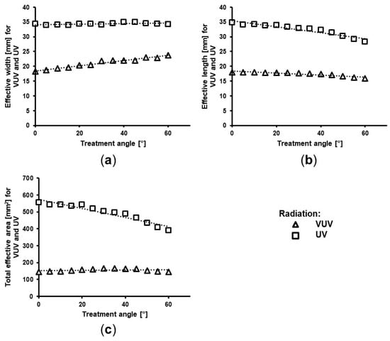 The width of the effective zones increased by 23% in the case of VUV and remained stable for UV, whereas the length remained stable for VUV and decreased by 19% for UV with a rising incidence angle of the kINPen® MED-β (Figure 11a,b). The total area of VUV was smaller compared to UV because of the strong absorption within the ambient air outside the argon gas-containing plasma effluent (Figure 11c). Additionally, the total area of the UV radiation zone decreased by 21%, whereas the size of the VUV zone was independent of the incidence angle.