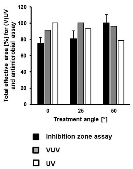 The total area of the inhibition zones (S. aureus) increased (Figure 6c), whereas UV slightly decreased and VUV remained stable with rising incidence angle (Figure 12).