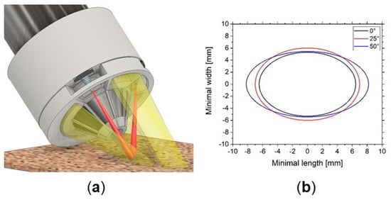 The different parameters to detect the effective area of the kINPen® MED-β were used for the design of a top unit for the device. The combined concept (Figure 13a) comprised a distance measurement via IR laser signal propagation time sensors with a focus on the working point in the effluent and an replaceable ring aperture. This—disposable or autoclavable, as requested—aperture can illuminate the effective area of the kINPen® MED-β for the pre-defined treatment angle of, e.g., 0° or 45°. Each aperture will be manufactured and provided according to the requirements of the medical personnel either for perpendicular or tilted treatment. Thus, the operator can adjust the selected aperture based on the wound accessibility and space for handling the device at the bedside. The provided measurements (inhibition zone, ROS, VUV, UV) led to a better understanding of the cocktail component contributions and distributions which allowed for the deduction of the dimensions (length and width) for the illumination of the effective area. However, the technical solution requires a defined spatial dimension at each given angle. Taking into account the complexity of the plasma cocktail components, a minimal effective area was defined to determine the illumination dimensions for the aperture at each given angle (Figure 13b). The resulting dimensions for the investigated treatment angles were calculated with an elliptical fit. A clear impact of the treatment area was shown over the investigated range of treatment angles. This motivates an adjusted aperture for application conditions. While the treatment angle of 0° and 25° changed the effective area from 107 mm² to 132 mm², the shape remained rather constant. For 50° however, the shape changed significantly while the area increased only slightly (140 mm², +31% in total).