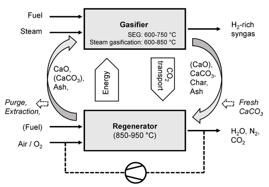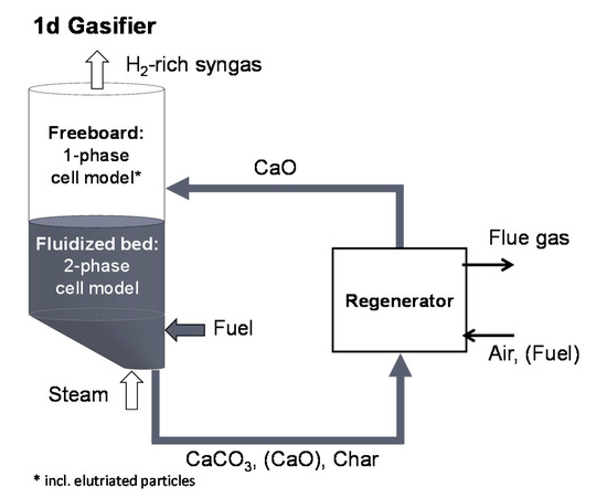 Sorption enhanced gasification (SEG) has been considered a promising technology for tailored syngas production with in situ CO2 capture. The plant configuration of a SEG process is based on the conventional steam gasification process carried out in indirect heated (or allothermal) dual fluidized bed systems. This conventional steam gasification process uses an inert bed material as a heat carrier to deliver the heat for the endothermic gasification, enabling N2-free syngas with typical hydrogen content of 20–40 vol% (on a dry basis). The syngas of this process can be used for power and heat generation, and the technology has already been applied in a number of industrial-scale facilities with thermal power ranging from 2–20 MW [3,4,5]. Accordingly, a number of different models describing the steam gasification of biomass have been developed and published [6,7,8].