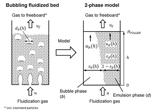 For modeling purposes, the fluidized bed was split into two phases, a solid-free bubble phase (fraction: εb) and a solid-loaded dense phase (fraction: 1-εb), as shown in Figure 3.