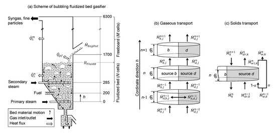 (a) Scheme of bubbling fluidized bed gasifier with levels (in mm) of inlet/outlet flows; Cell model of the fluidized bed, (b) Gaseous flows, and (c) Solid flows.