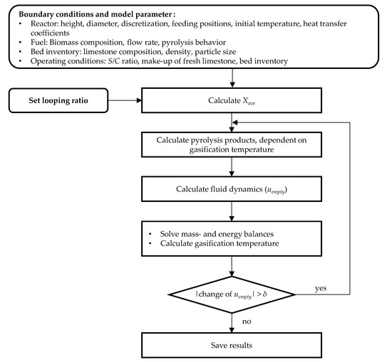 After setting boundary conditions and model parameters, the average CO2 carrying capacity is calculated using the make-up flow of fresh limestone and the looping ratio. Starting from an initial temperature, first the pyrolysis products and then the fluid dynamics of the gasifier are calculated. After solving the mass and energy balances, a new gasification temperature is calculated, and the pyrolysis step is updated for a certain looping ratio. This is iterated until the change of the empty reactor velocity, uempty, is smaller than a defined value δ; then, the results of the operation point are saved in a file.