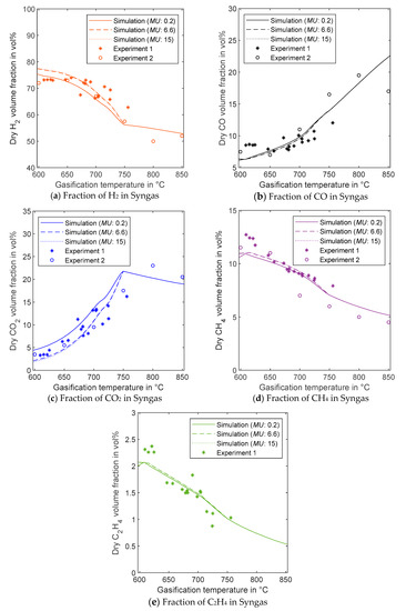 In Figure 7a–e, the simulated volume fractions of synthesis gas components (H2, CO, CO2, and CH4) and non-condensable hydrocarbons (in the form of C2H4) are plotted over a gasification temperature between 600–850 °C. For each synthesis gas component, the curves of three different make-up flows (0.2 kg/h, 6.6 kg/h, and 15 kg/h) are shown to demonstrate its influence on the gas volume fraction. Additionally, experimental results derived from both 200 kW (Experiment 1) and 20 kW (Experiment 2) DFB systems are included to evaluate the simulated volume fractions.