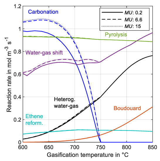 Table 1 lists all the chemical reactions considered in the model, including equations to calculate the reaction rates. The pyrolysis step (reaction 1) is modelled with a one-step reaction kinetic considering the products: Ash, char, H2O, gases (CO2, CO, CH4, and H2), non-condensable hydrocarbons (simplified as C2H4), and tars (simplified as Naphthalene: C10H8). For the mass fractions ωj, experimental data from Fagbemi et al. [34] were used and interpolated to consider a temperature-dependent pyrolysis product composition. The values for the amounts of tar, however, originate from experiments with the 200 kW DFB system [19] and, hence, secondary pyrolysis reaction modelling was not required. With this assumption, catalytic effects of CaO on tar conversion are indirectly considered by measured concentrations. Residual char was handled as a mixture of C, H, and O and, according to the char analysis from Fagbemi et al. [34], the composition was also interpolated for different gasification temperatures. It is worth noting that the used elemental analysis of wood pellets (C: 48.99 wt.-%waf, H: 6.97 wt.-%waf, O: 44.04 wt.-%waf) differed from the analysis of biomass in Fagbemi et al. [34]. Thus, yields from pyrolysis ωj needed to be adapted, in order to satisfy the elemental balance. Therefore, a linear equation system for the elements C, H, and O had to be solved. While coefficients from C10H8, CH4, C2H4, H2O, and char were fixed, the coefficients of CO, CO2, and H2 were fitted to close the elemental balance of wood pellets.