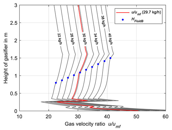 In Figure 4a, a schematic diagram of the bubbling fluidized bed gasifier facility is shown, including the inlet/outlet gas and solid flows, as well as details of their axial position (in mm). These data were used to parametrize the simulation model. Here, is the mass flow at the outlet of the regenerator to the gasifier. By tuning this mass flow rate, the desired gasification temperature can be achieved. The height of the fluidized bed, HFluidB, depends on the fluidization velocity and, hence, the distance between the inlet of and HFluidB is variable.