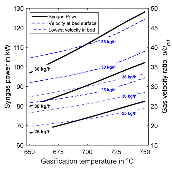 The fluidized bed gasifier consists of a fluidized bed and a freeboard. Since main gasification reactions are located close proximity to solids, the gasification temperature is referred to as the average temperature in the fluidized bed. In this work, a gasifier temperature between 600–850 °C was investigated by means of simulations.