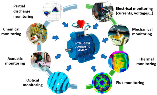 Over recent decades, there has been an increasing effort oriented toward the development of predictive maintenance techniques to determine the condition of certain parts of the machines. These techniques rely on monitoring different motor quantities (currents, vibrations, temperatures, fluxes, partial discharges…) and analyzing them properly to detect possible evidences of the development of the fault. After many years of investigations in this area, one of the most important conclusions is that there is no method relying on a single quantity that is able to determine the integral condition of the whole motor, since each specific technique has shown good results for the diagnosis of certain faults but not for others. For instance, vibration data analysis is universally accepted as an excellent technique for the detection of mechanical failures, but its sensitivity is much worse when detecting other types of faults. As a result of the previous facts, the current trend is to develop intelligent systems that combine the information obtained from the application of diverse techniques based on the analysis of different quantities. The fact of relying on multiple and complementary informational sources enables reaching a more accurate and robust conclusion of the integral motor health. This idea is illustrated in Figure 1.