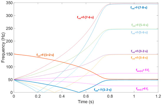 On the other hand, in case of eccentricities or misalignments, rather different components evolutions will appear. The most relevant are those of the components f − fr and f + fr that evolve from the supply frequency (f) toward their final frequencies at steady state (approximately f/2 and 3·f/2) for a machine with two pole pairs) [19]. Figure 2 shows the expected evolutions for the most relevant harmonics associated to rotor damages (denoted by frot) and eccentricities/misalignments (denoted by fecc) that are present in the motor starting current, considering a direct on-line starting.