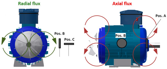 Usually, the most common locations for the stray flux sensors are those depicted in Figure 3. As reported in several works [36,37], depending on the sensor position, a higher portion of axial or radial flux will be captured, and therefore, the corresponding components (axial or radial) will be present in the results of the analyses of the corresponding signal. In this regard, at Position A, the sensor mainly captures axial flux. On the contrary, the flux captured at Position C is primordially radial. Finally, Position B captures a portion of axial and a portion of radial flux.