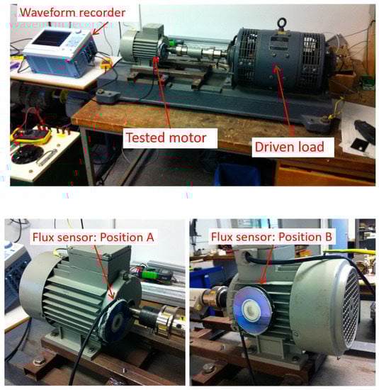 Several tests were carried out in the laboratory using different 1.1 kW, 4 pole cage induction motors with different levels of rotor failure and misalignment [10]. In the experiments, the tested motor was coupled to a DC that had the function of load. In each test, the motor was started direct on-line, and it operated until the steady-state regime was well reached; the phase current waveform under the starting was captured by means of a current clamp that was connected to the oscilloscope. In addition, a self-built flux sensor (manufactured at Universitat Politecnica de Valencia, Valencia, Spain) based on a coil with 1000 turns was attached to the external part of the motor frame [28]. The waveform of the electromotive force (emf) induced in the sensor by the stray flux was registered by means of the previous oscilloscope. Different tests were performed for the motor operating under various levels of failures and under different loading conditions. Moreover, different locations of the coil sensor were considered (the three considered positions are those shown in Figure 3). Both the starting current and the stray flux signals were registered using a sampling rate of 5 kHz. The registered waveforms were later transferred to a computer where they were analysed by applying a specific time-frequency transform: the Short-Time Fourier Transform (STFT). Figure 4 shows a picture of the test bench (built at Universitat Politecnica de Valencia, Valencia, Spain) and of two of the considered positions of the stray flux sensor.