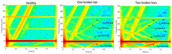 Figure 5 shows the time-frequency maps resulting from the application of the STFT to the starting current signals for three different fault conditions of the motor: healthy motor, motor with one broken bar, and motor with two broken rotor bars. All experiments were carried out at at Universitat Politecnica de Valencia, Valencia, Spain. Note the clear differences between all three maps; the evolutions of the fault harmonics are clearly evident for the faulty cases. In particular, the evolutions of the main sideband harmonics (f·(1 − 2·s) and f·(1 + 2·s)) are especially clear. In addition, the evolutions of higher-order rotor fault-related harmonics, such as f·(5 − 4·s) and f·(5 − 6·s), are clearly noticeable. These are clear indicators of the presence of the rotor damage. Finally, note how the intensity of the patterns created by the fault harmonic evolutions are higher when the level of rotor failure increases.