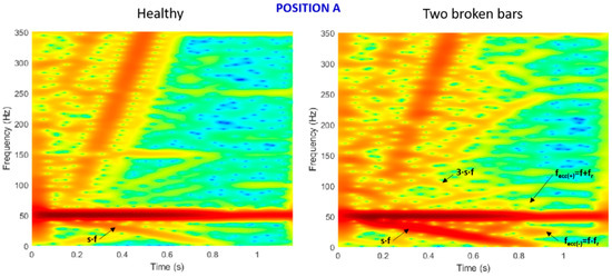 On the other hand, Figure 6 and Figure 7 show the time-frequency analyses of the stray flux signals under starting for the healthy motor and for the motor with two broken bars for two considered positions of the coil sensor: position A and position B. In comparison with Figure 5, note the much richer harmonic content of the stray flux maps depicted in Figure 6 and Figure 7. This illustrates an interesting advantage of stray flux analyses: since more evolutions can be identified in the time-frequency maps, the diagnosis will be more reliable, since it will rely on multiple harmonic evolutions rather than on evolutions of a few fault components. Moreover, note the clear differences between the healthy and faulty cases; much more harmonic evolutions are discernible in these latter cases. This is because the patterns caused by the evolutions of the fault harmonics are clearly amplified in these latter cases. More specifically, note the clear evolutions of the axial components, given by s·f and 3·s·f, that are amplified by the rotor damages. These components are already present in healthy condition (since they can be created by inherent eccentricities in the motor), but their respective amplitudes are clearly incremented when the fault is present. These components (that are not observed in the starting current analyses, see Figure 5) can be visualized in the graphs of Figure 6 and Figure 7 because these two sensor positions (position A and B) are those capturing a major portion of axial flux, as commented above (see Figure 3). On the contrary, note that the evolutions of the radial components such as f·(1 − 2·s) and f·(1 + 2·s) are less observable.